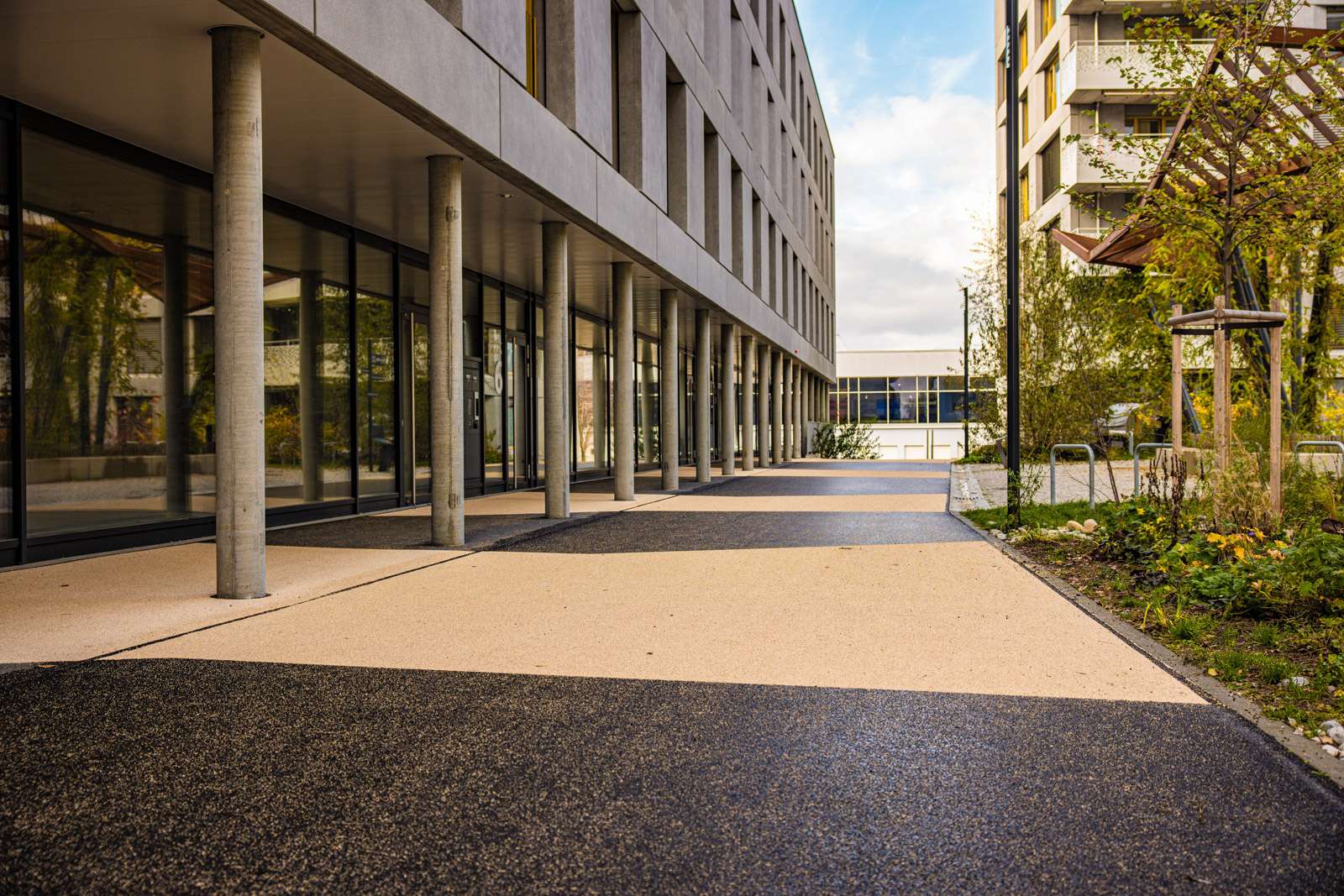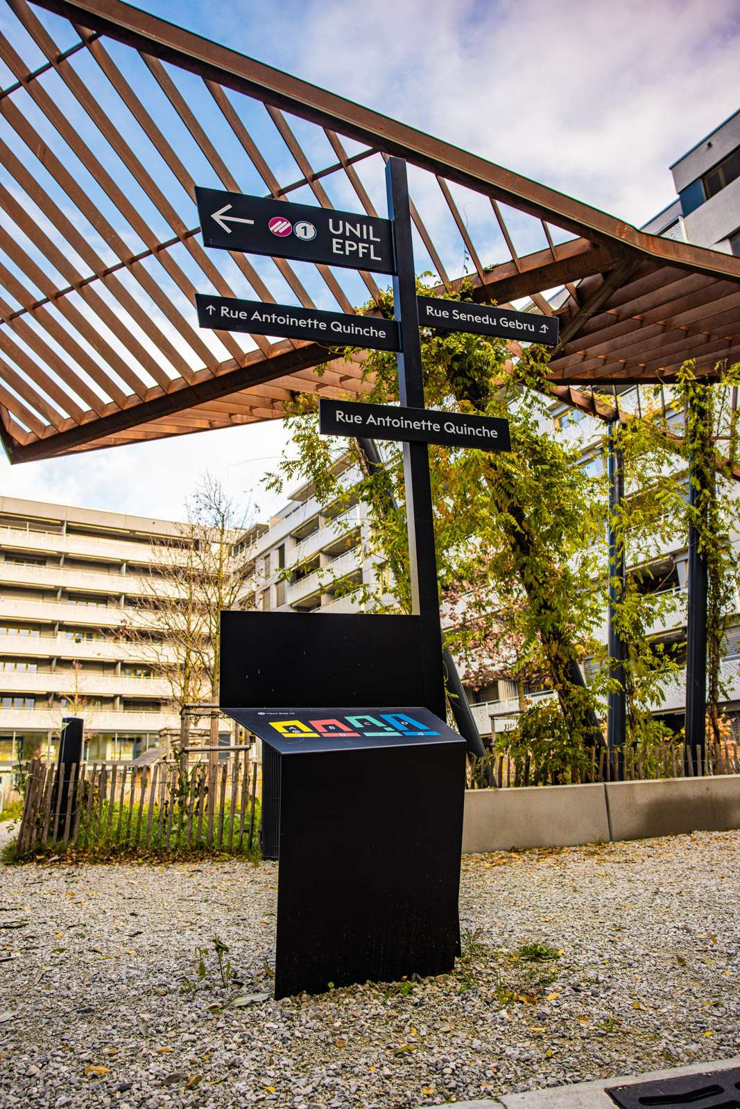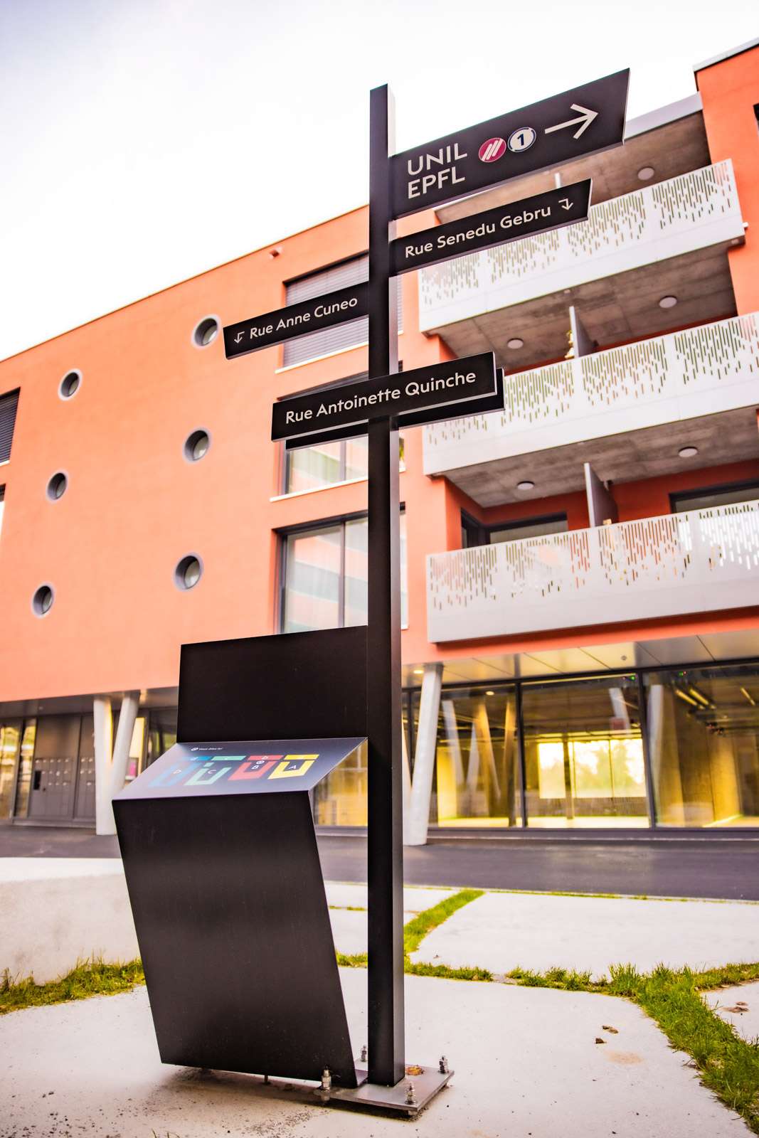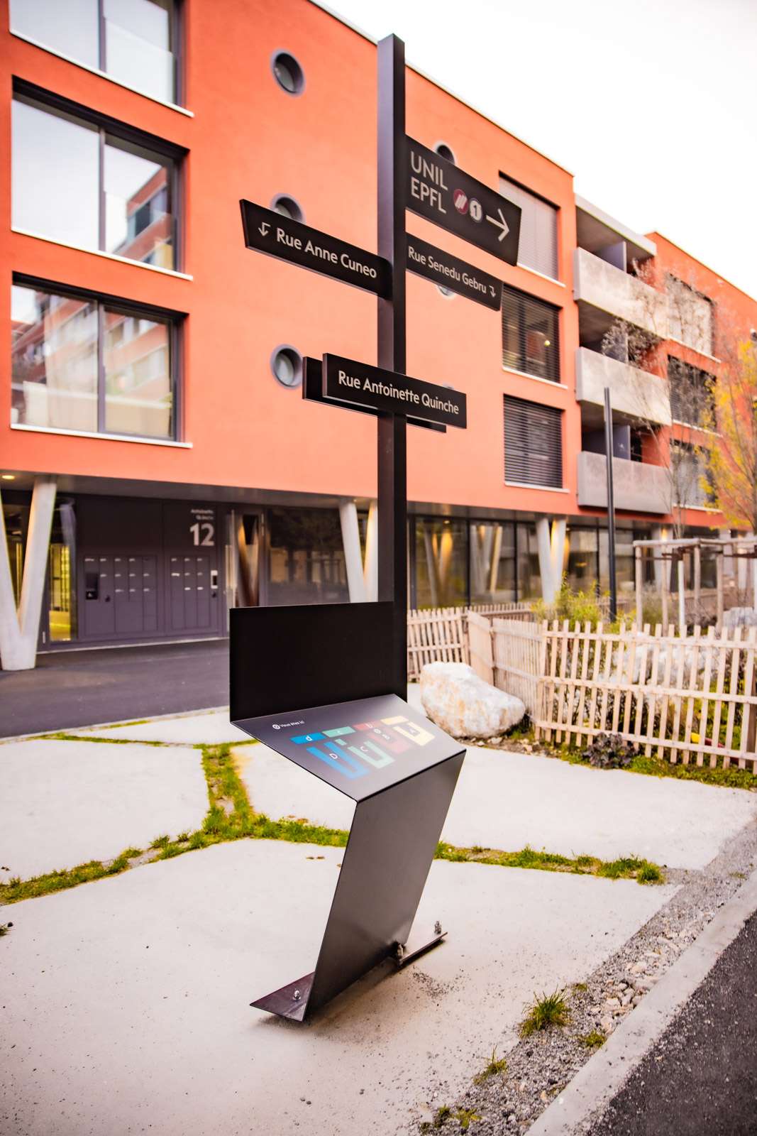 Installation des panneaux de signalisation et des dispositifs d’orientation, incluant des totems réalisés en collaboration avec Ducommun SA.